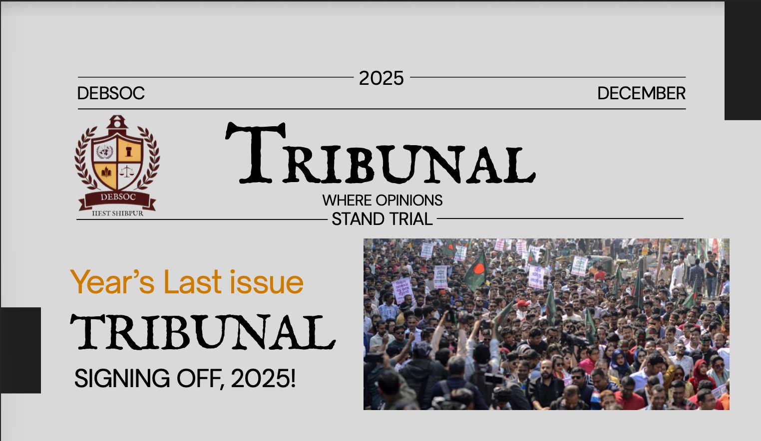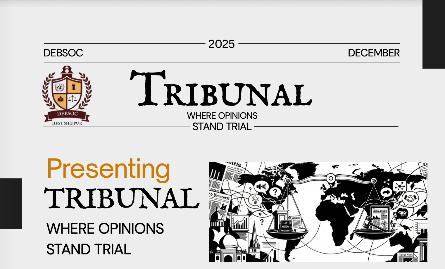 Tribunal is the signature fortnightly magazine curated and released by the Debating Society (DebSoc), IIEST Shibpur. It serves as a bridge between the campus and global discourse.